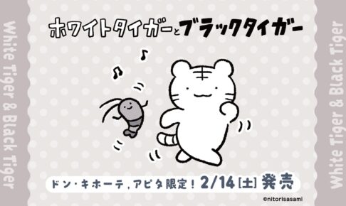 イラストレーター「にとりささみ」さんが手掛ける、SNSで人気のゆるゆるシュールコメディ作品「ホワイトタイガーとブラックタイガー」× 全国のドン・キホーテ / アピタにて、2026年2月14日よりコラボグッズが発売される。