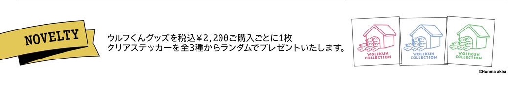 「やさしいおおかみ ウルフくん」ポップアップストアにて、グッズをお買い上げ2,200円(税込)毎に特典として「クリアステッカー 全3種」がランダムに1枚プレゼントされる。