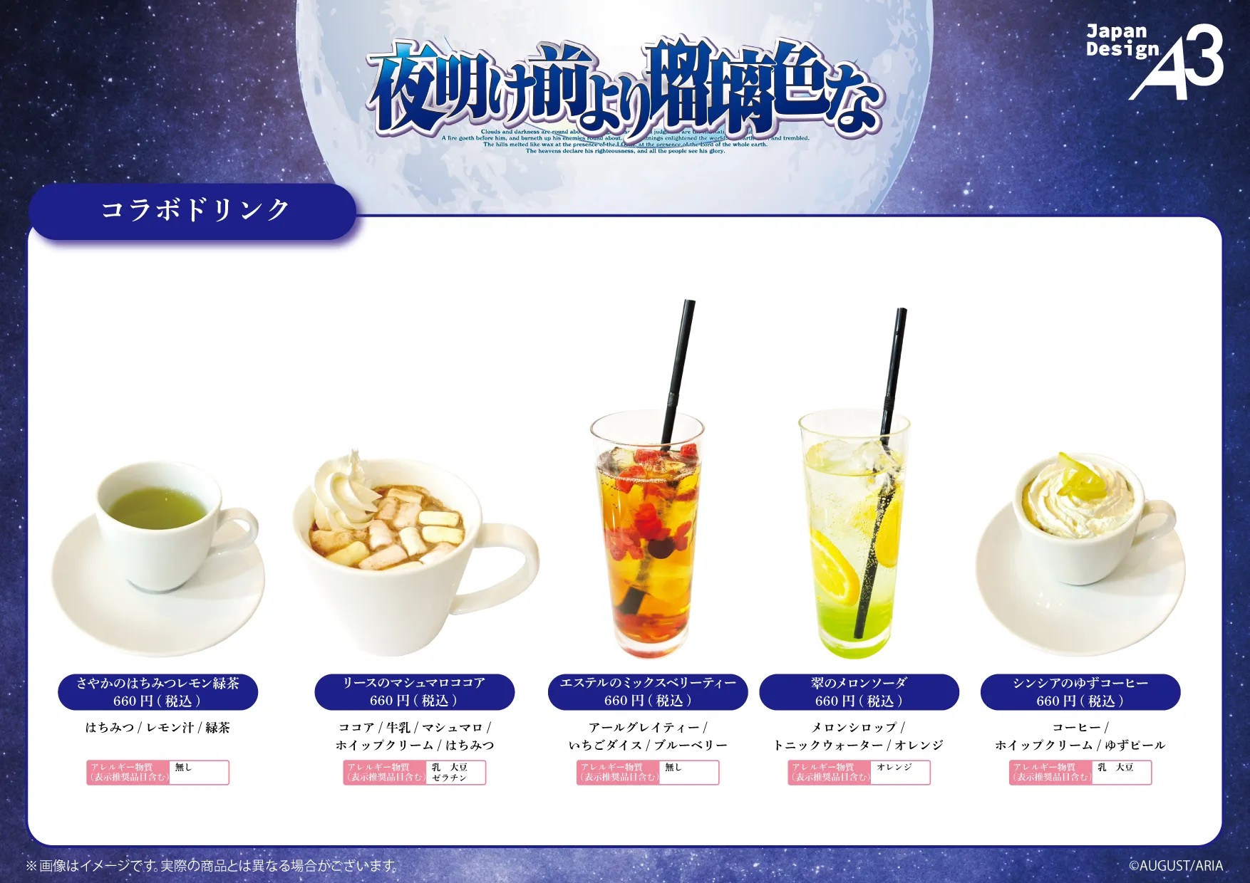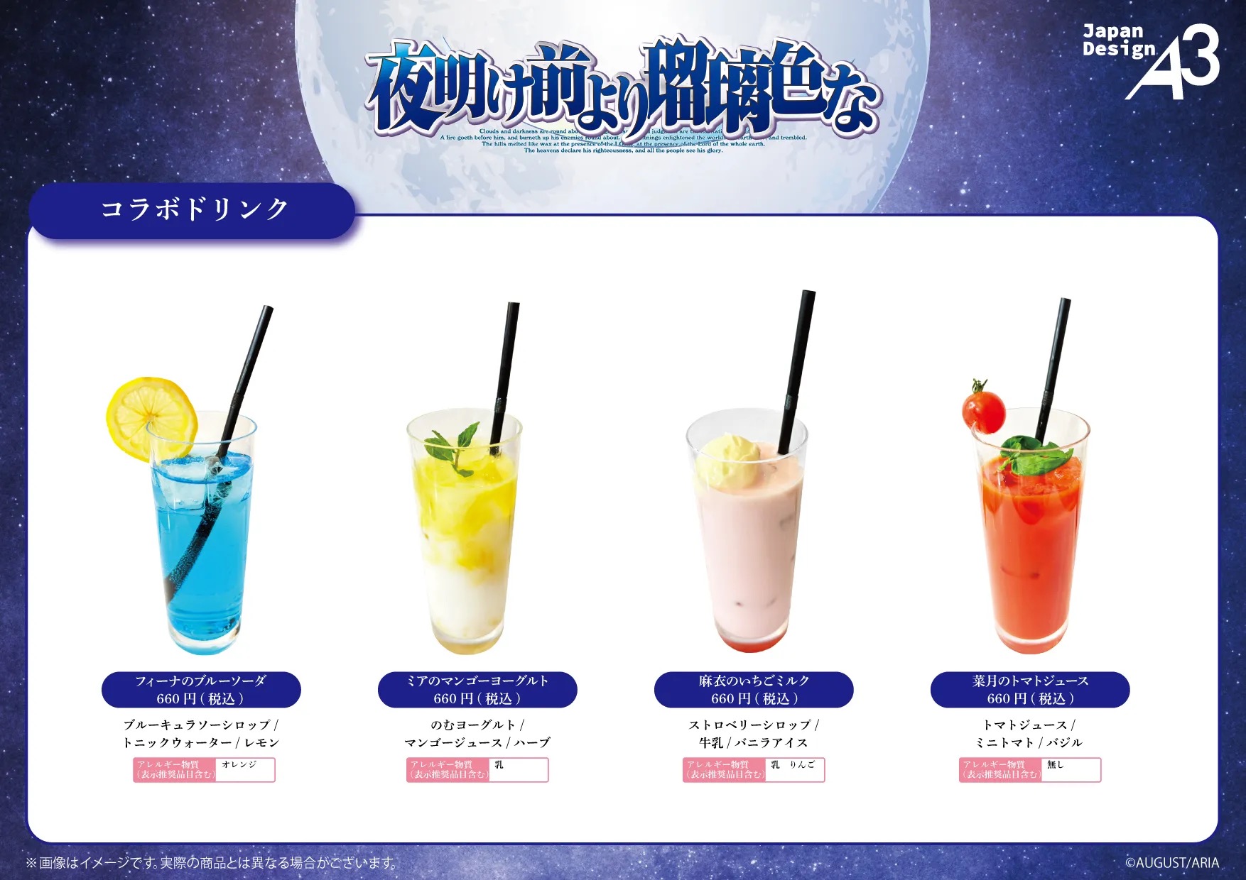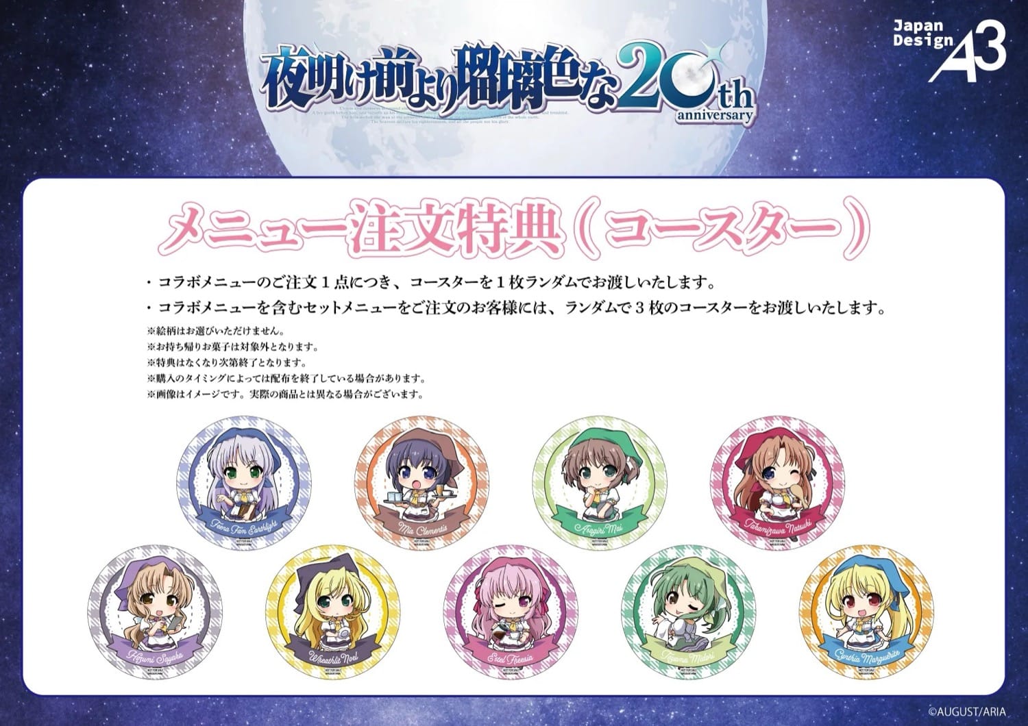 麻衣・菜月・翠ら人気キャラクターをイメージしたコラボメニューがお楽しみいただける他、メニューを注文の方には「夜明け前より瑠璃色な」カフェ限定のノベルティー「コースター」がランダムに1枚プレゼントされる。