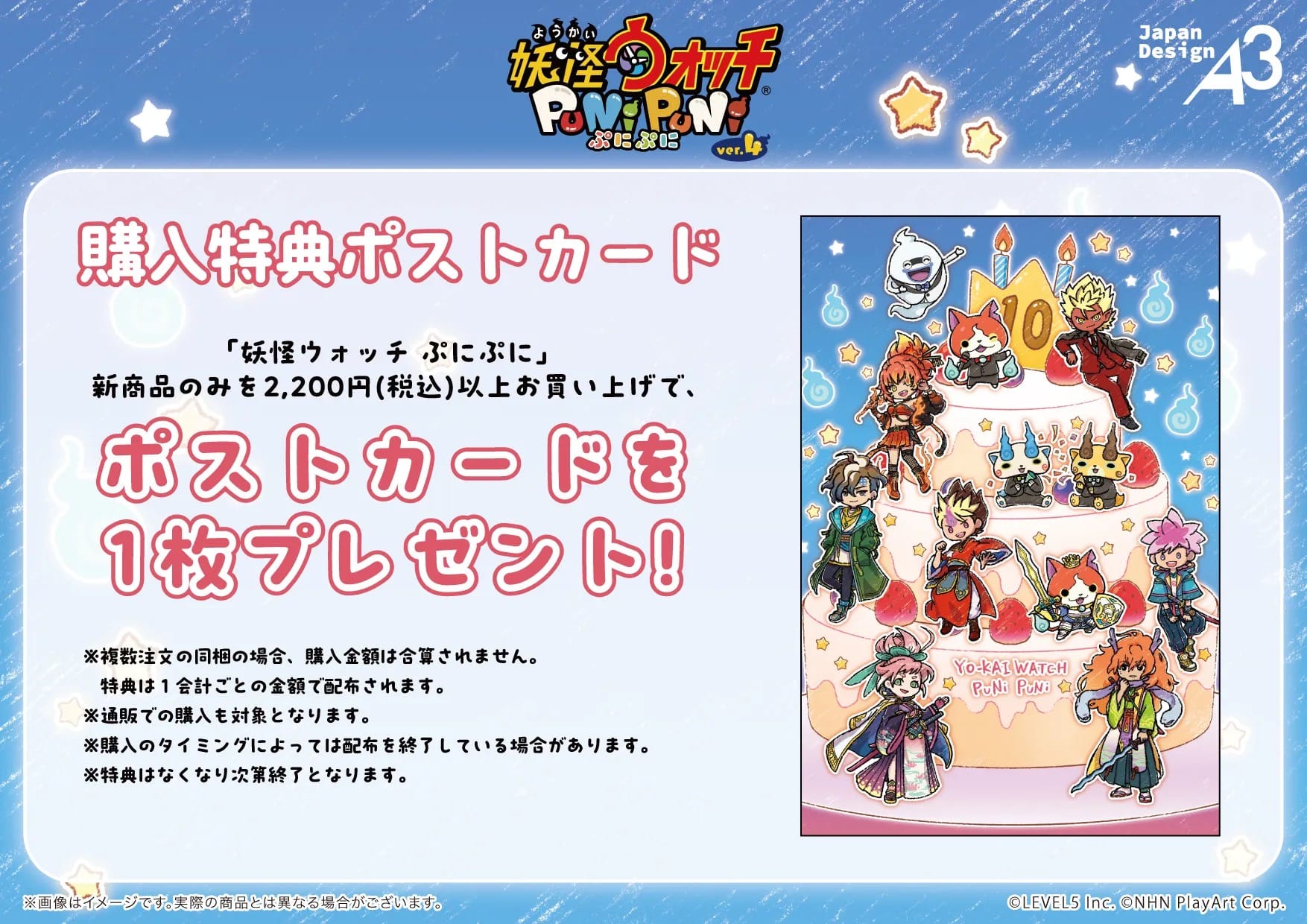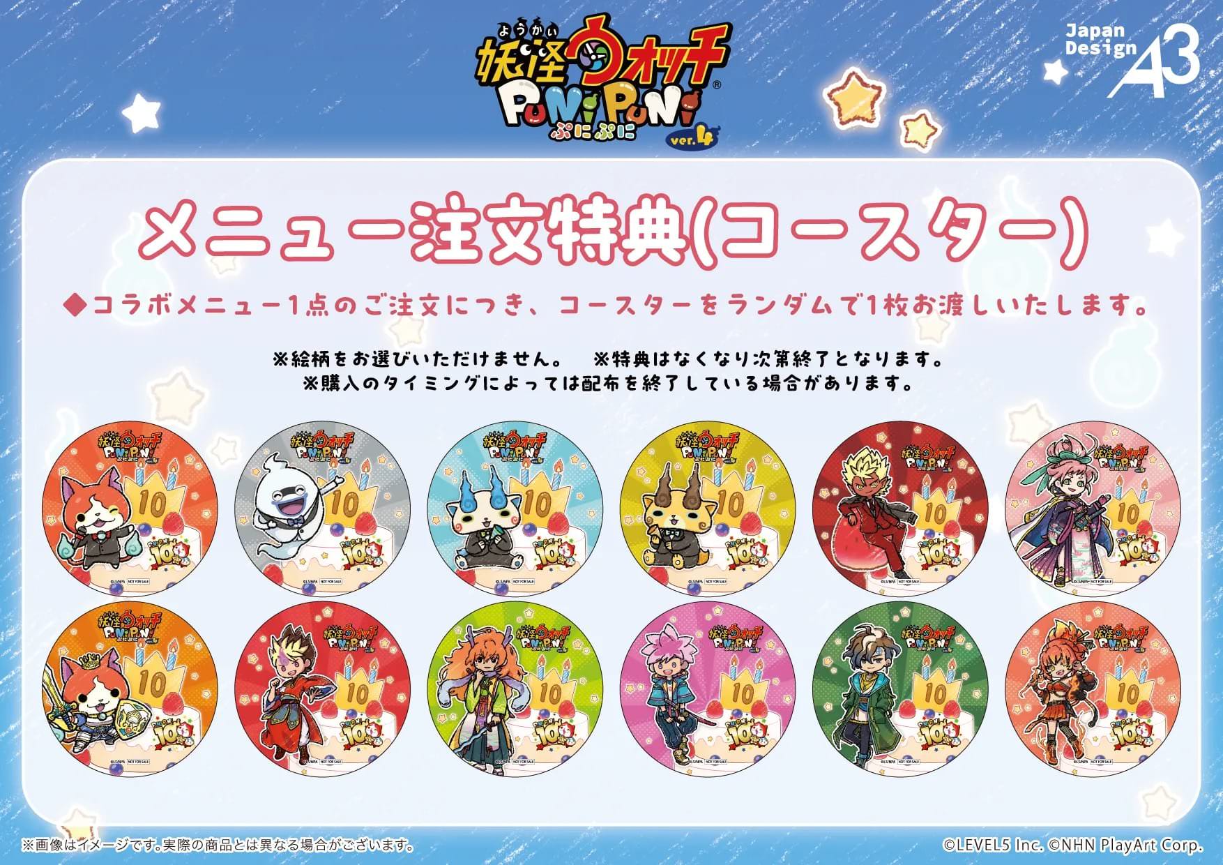 「妖怪ウォッチ ぷにぷに × eeo Cafe」コラボにて、コラボメニューを1品注文するごとに「コースター (全12種)」をランダムに1枚、新商品のみを2,000円(税込)以上お買い上げで「ポストカード」を1枚プレゼント!