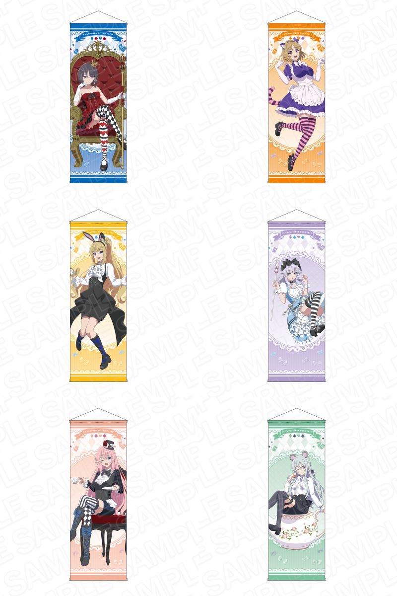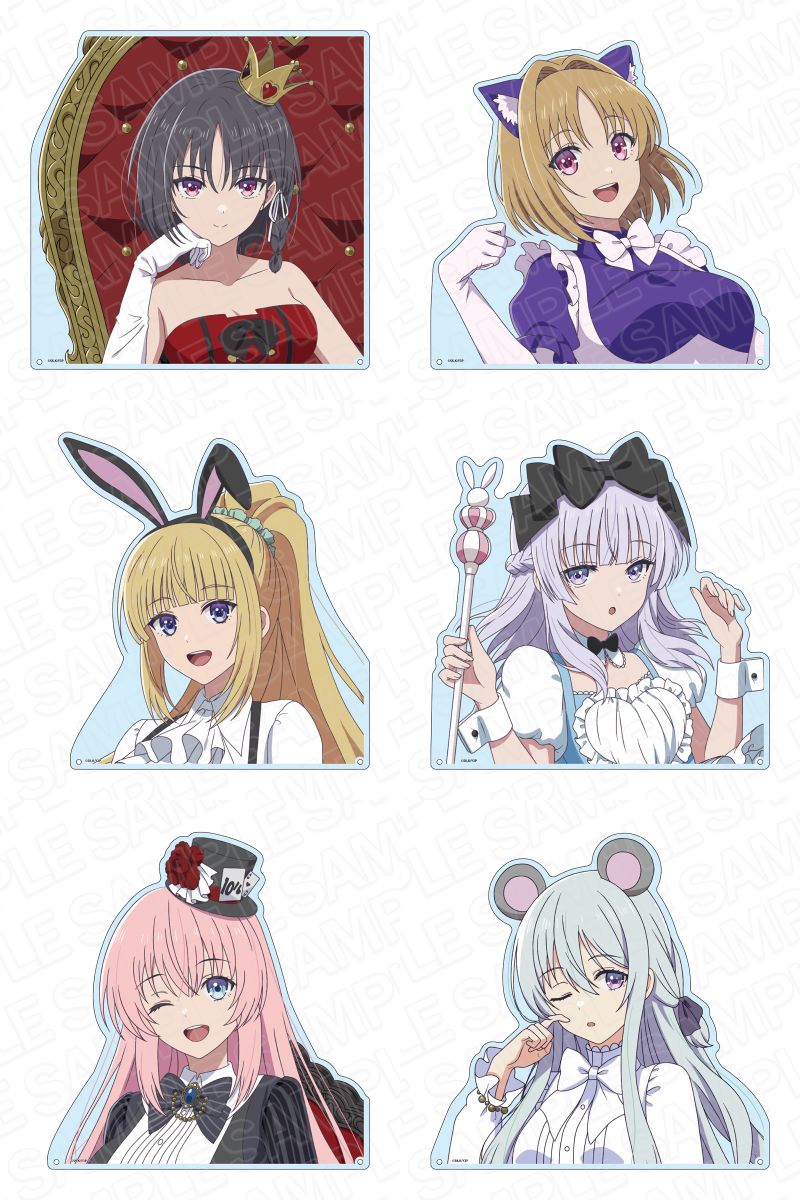 個性溢れるアリスのコスチュームに注目したい、鈴音・恵・桔梗・有栖・帆波・ひよりら人気キャラクターたちの「SNS風アクリルキーホルダー」「デカアクリルスタンド」「B2タペストリー」など全9種がラインナップ。