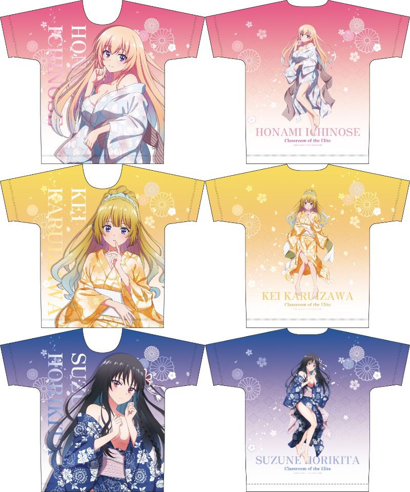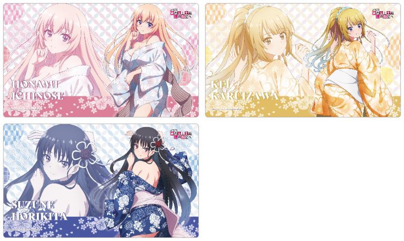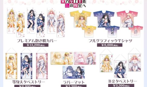 一之瀬帆波・軽井沢恵・堀北鈴音ら人気ヒロイン3人の和服姿を描いた「ラバーマット」「B2タペストリー」「BIGタペストリー」「フルグラフィックTシャツ」「抱き枕カバー」など全5種が好評につき再登場。