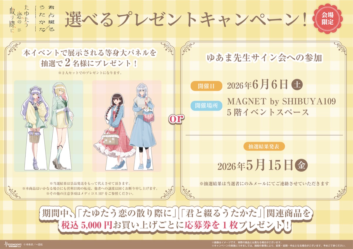 ゆあま先生による人気漫画「たゆたう恋の散り際に」&「君と綴るうたかた」のポップアップストアが、MEDICOS SHOP渋谷にて2026年4月14日〜4月27日まで開催される。