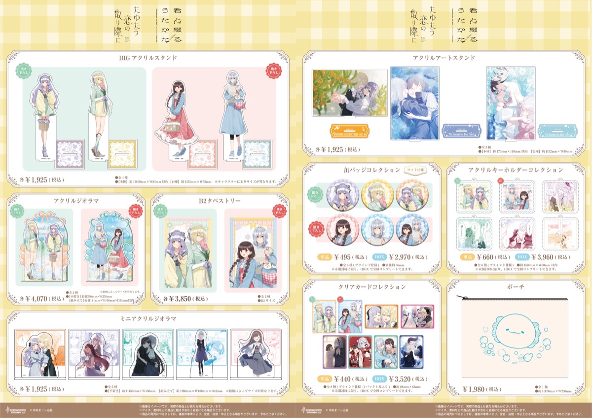 「たゆたう恋の散り際に」&「君と綴るうたかた」ポップアップストアでは、イベント限定の春らしいピクニックデートをモチーフとした可愛らしい描き下ろしイラストを使用した新作グッズが多数販売される。