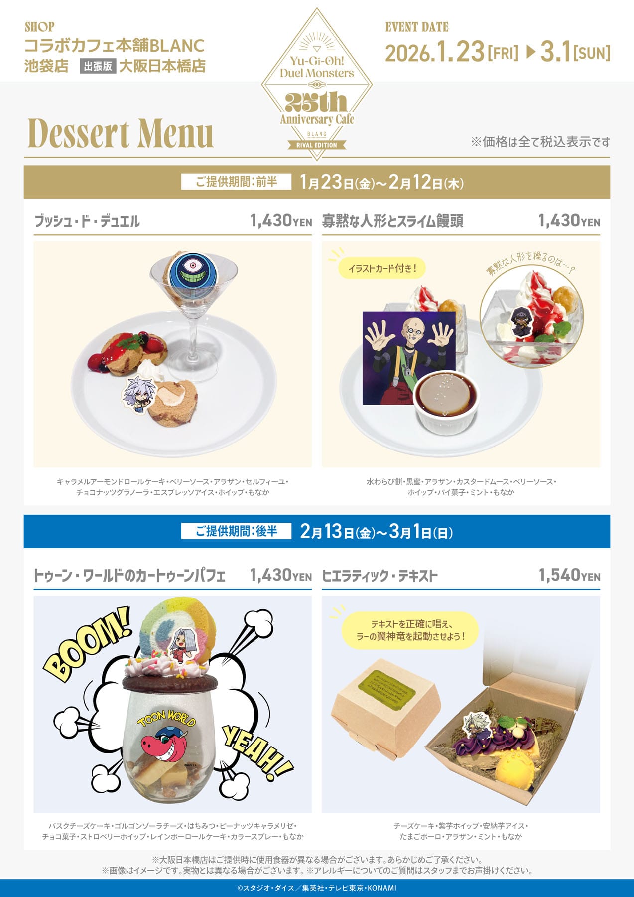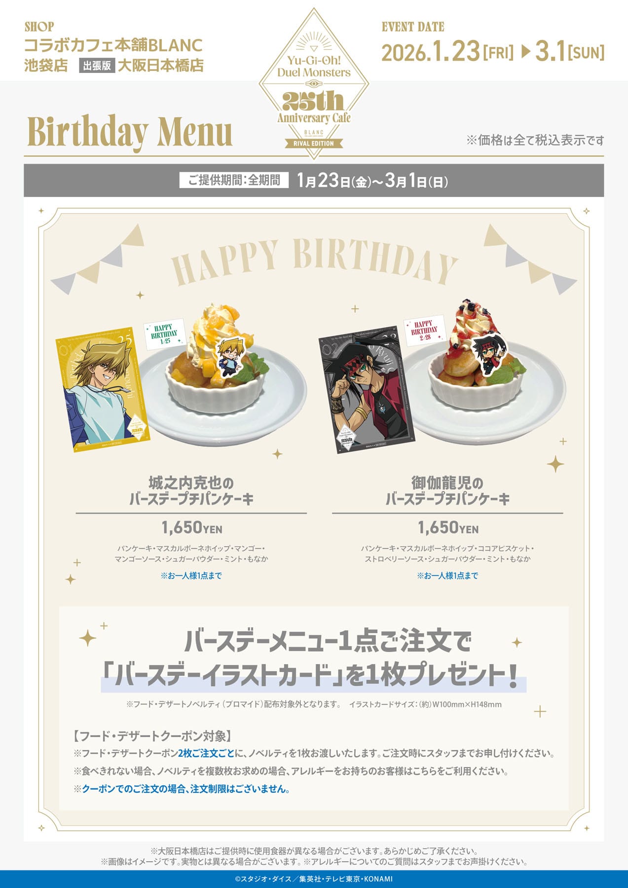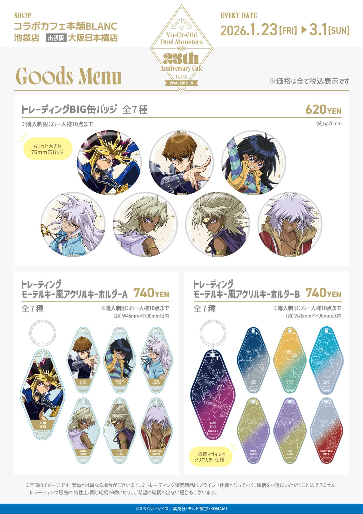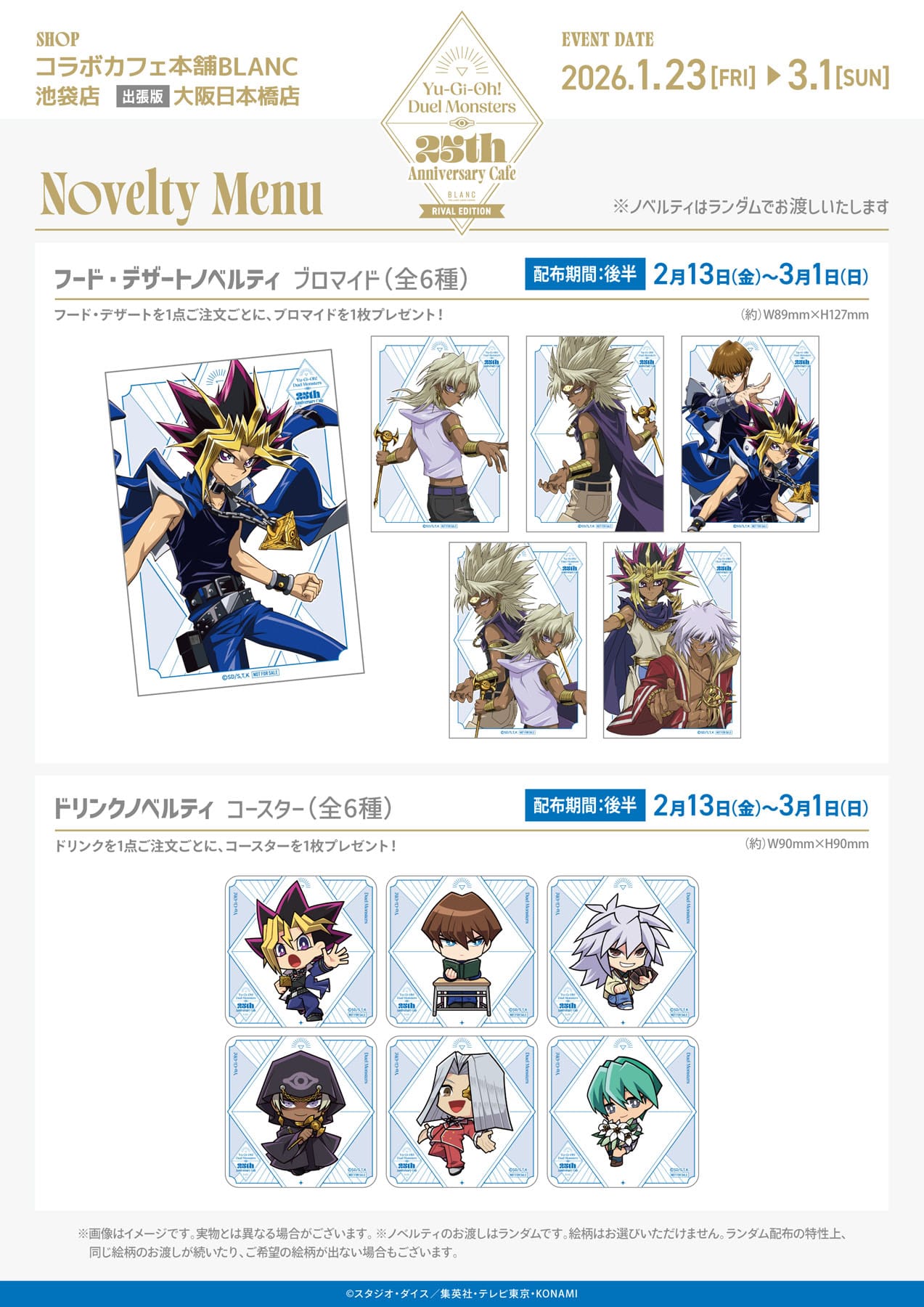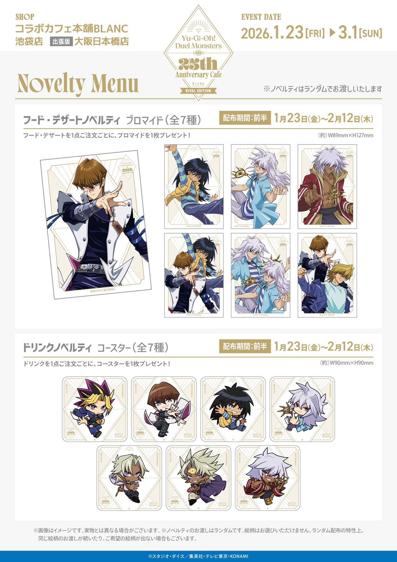 高橋和希先生による漫画を原作とする大人気シリーズ「遊☆戯☆王デュエルモンスターズ」× コラボカフェ本舗BLANC 池袋店・大阪日本橋店(出張版)にて、2026年1月23日〜3月1日までコラボカフェが開催される。