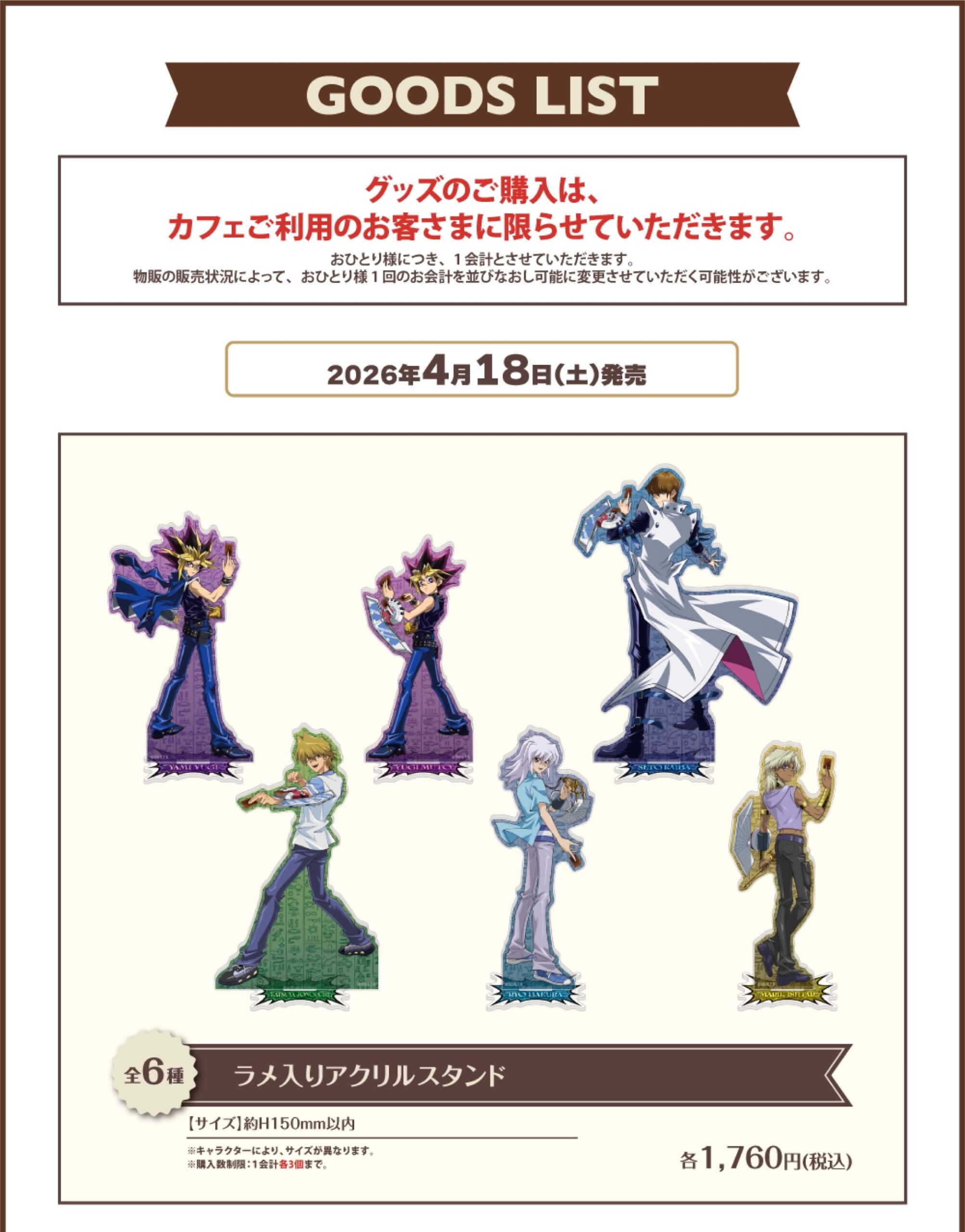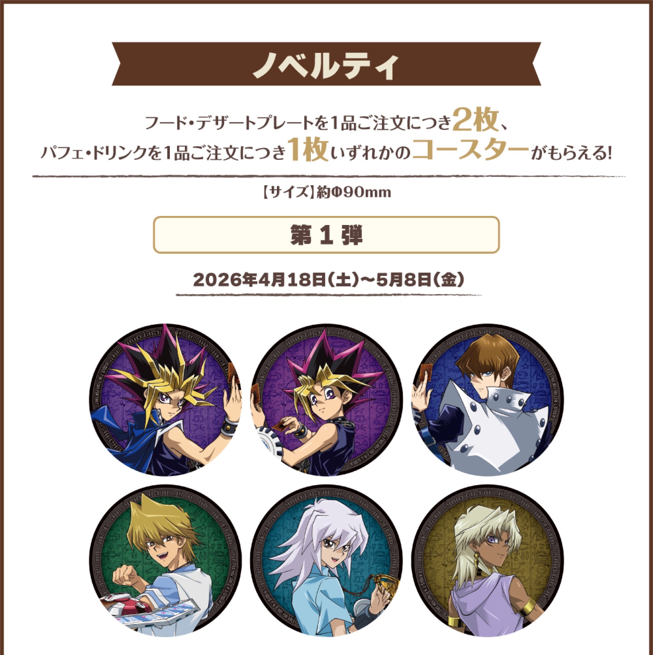 2026年4月18日〜5月31日まで開催される「遊☆戯☆王デュエルモンスターズ」コラボカフェでは、闇遊戯・武藤遊戯・海馬瀬人・城之内克也・闇バクラ・闇マリクらの描き下ろしイラストを使用したグッズが登場!