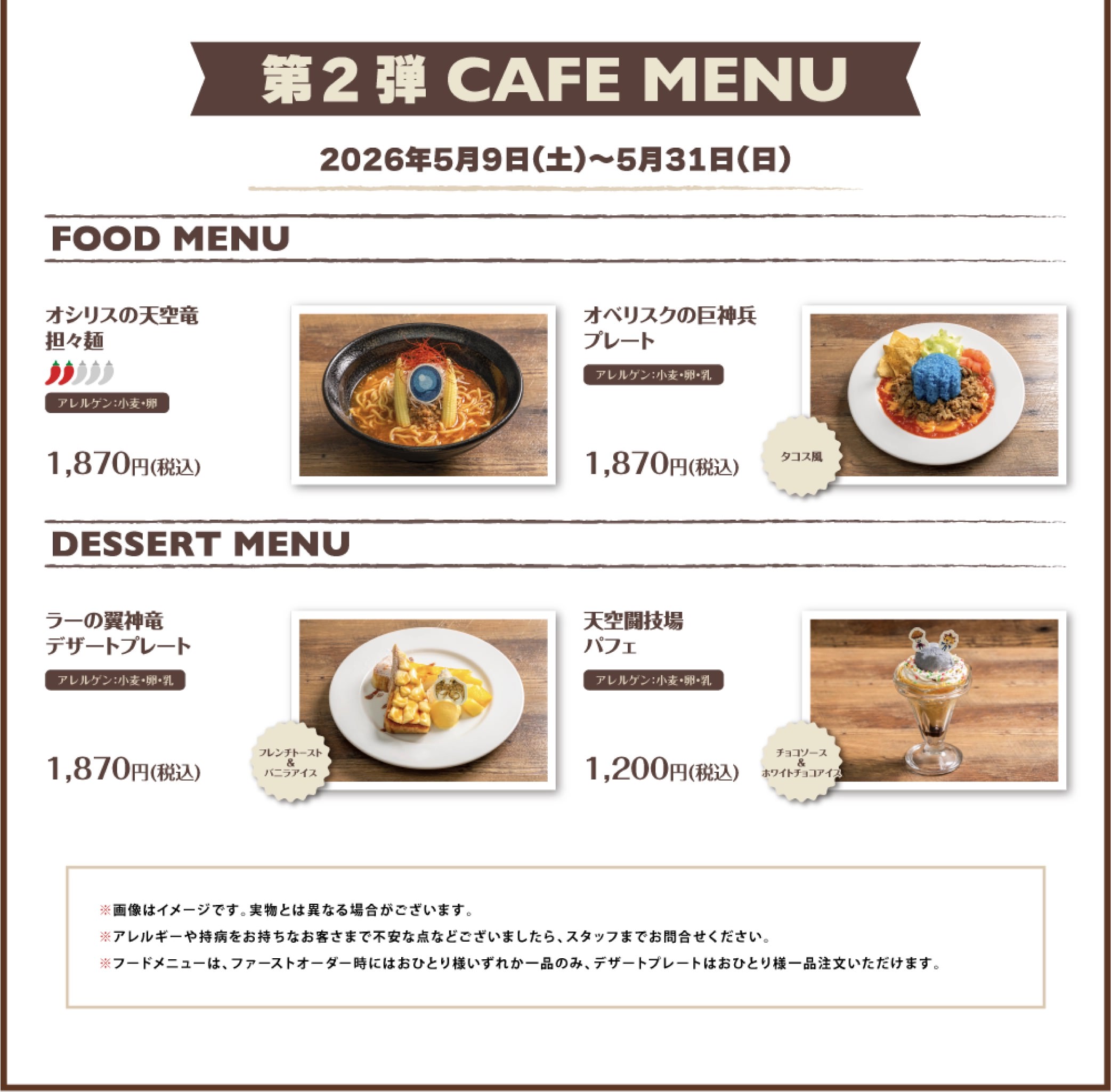 2026年4月18日より開催される「遊戯王 × GiGO」コラボカフェでは、期間ごとに第1弾(4月18日〜5月8日)と第2弾(5月9日〜5月31日)で異なるフード・デザートメニューが登場!