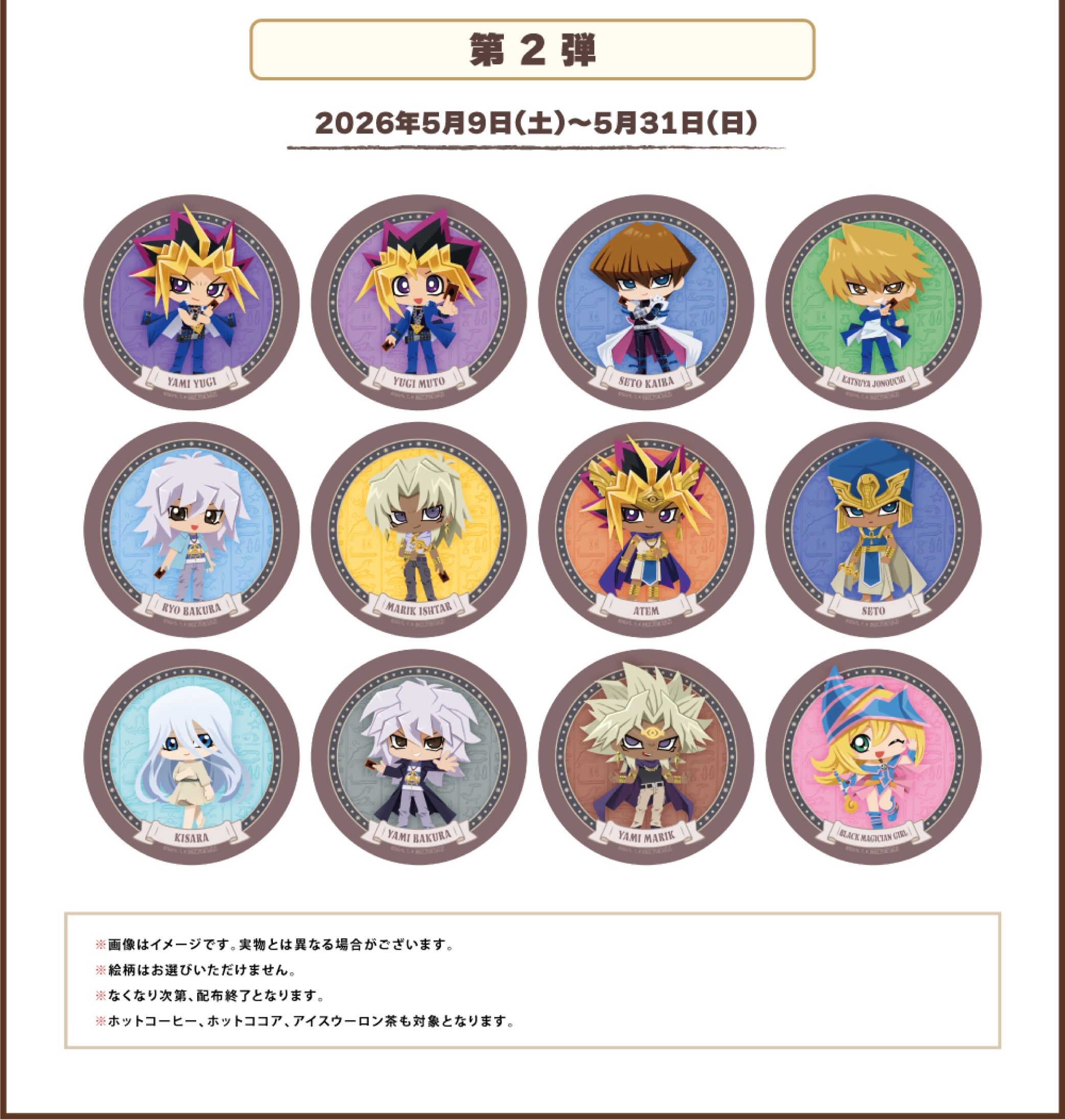 「遊☆戯☆王デュエルモンスターズ × GiGOコラボカフェ」にて、フード・デザートプレート1品ご注文につき2枚、ドリンク・パフェ1品につき1枚、特典として「コースター 第1弾:6種 / 第2弾:12種」をプレゼント!