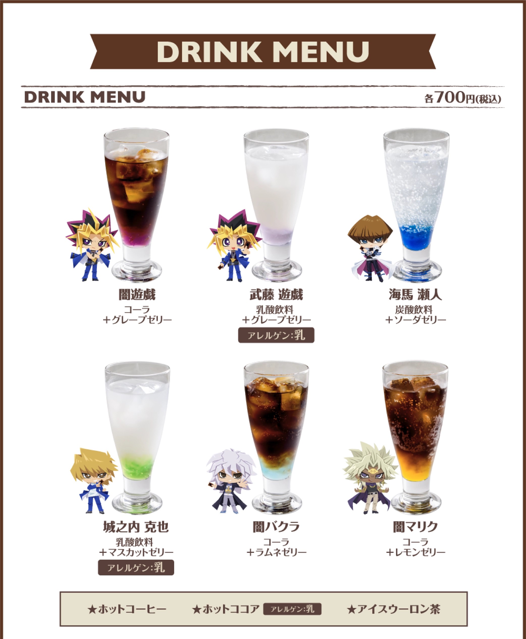 「千年パズルオムライス」や「絆のカプレート」「ブラック・マジシャン・ガール デザートプレート」などの期間で内容が切り替わるフードメニューが展開されるほか、ドリンクメニューは全期間共通の、各キャラクターをイメージした色鮮やかなドリンク6種類がラインナップ!