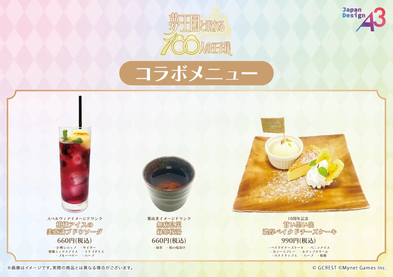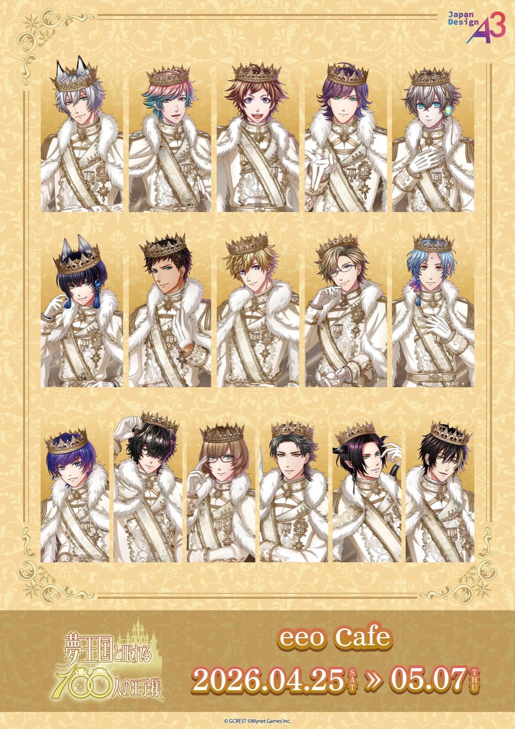 2026年4月25日より開催される「夢王国と眠れる100人の王子様 カフェ in eeo cafe」コラボでは、各国の王子様たちの個性を反映した全16種類のコラボドリンクと、特別なデザートが登場。