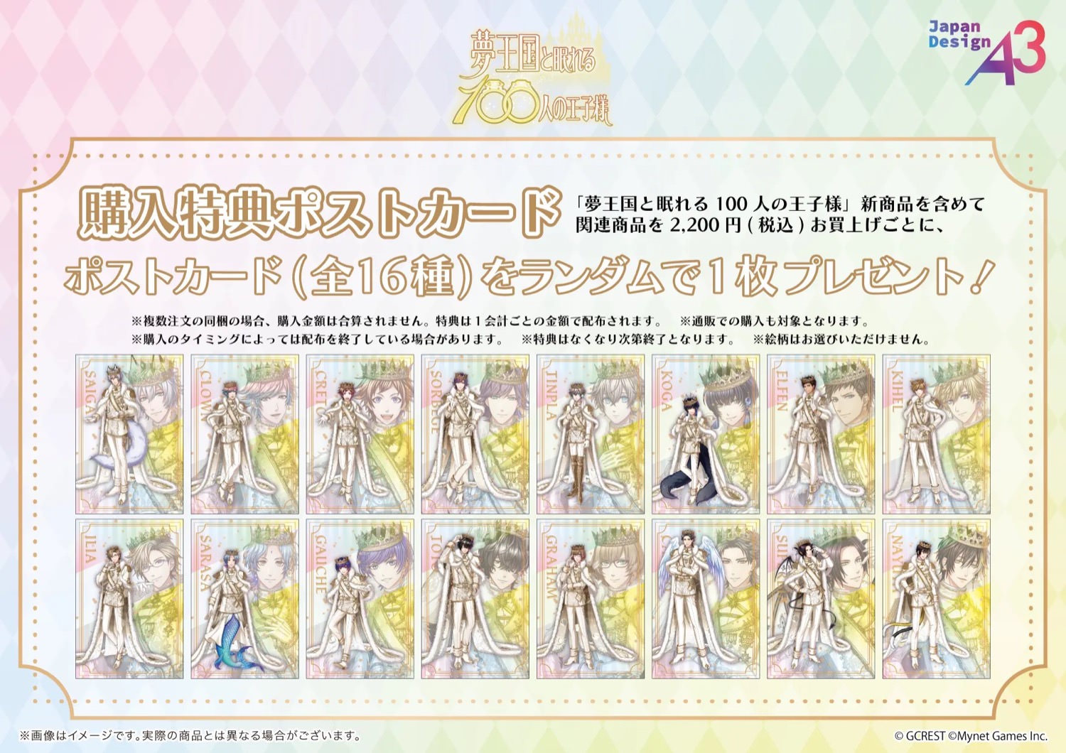 さらに、『夢王国と眠れる100人の王子様』新商品を含めて関連商品を2,200円(税込)お買い上げごとに、「ポストカード (全16種)」を1枚ランダムでプレゼント!