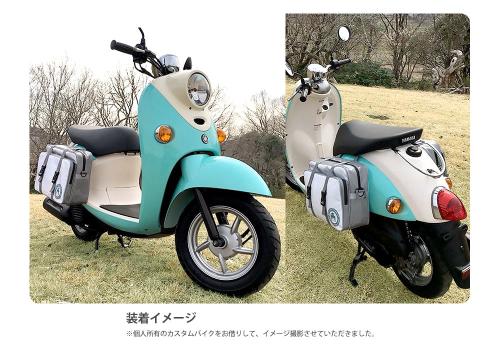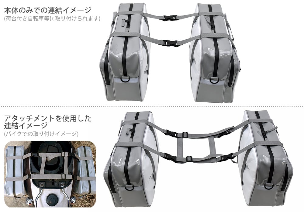 サイドバッグはバイクや自転車に取り付けできる仕様で、ショルダーバッグとしても使える。