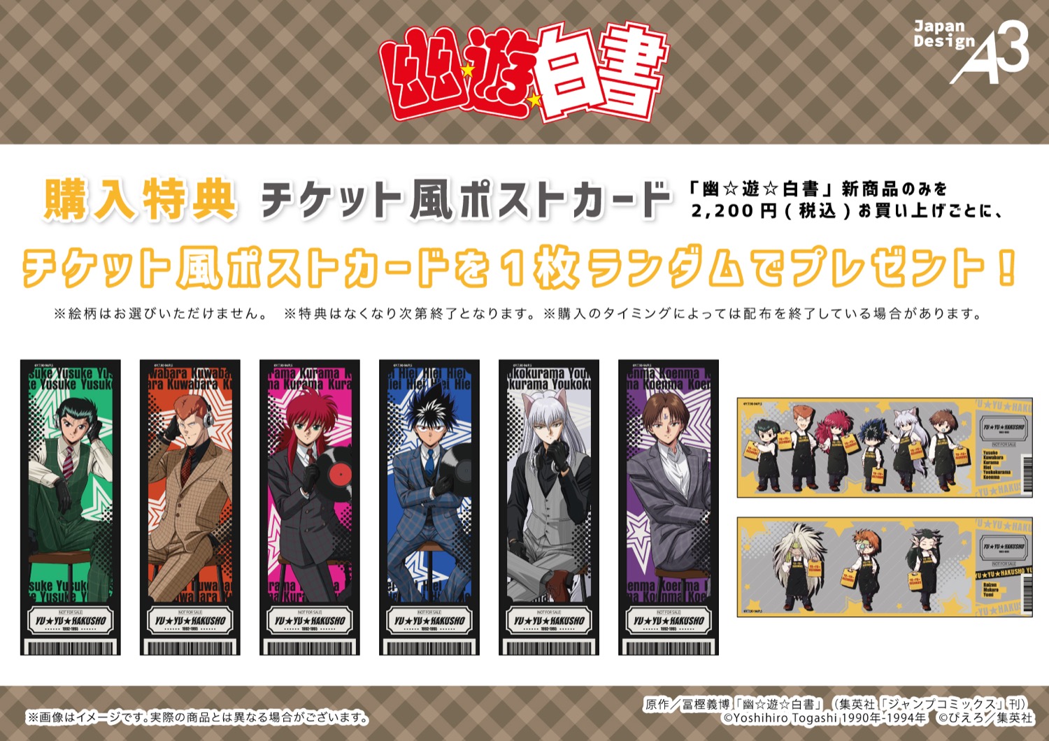「幽遊白書」ポップアップストアにて、グッズをお買い上げ2,200円(税込)毎に特典として「チケット風ポストカード 全8種」がランダムに1枚プレゼントされる。