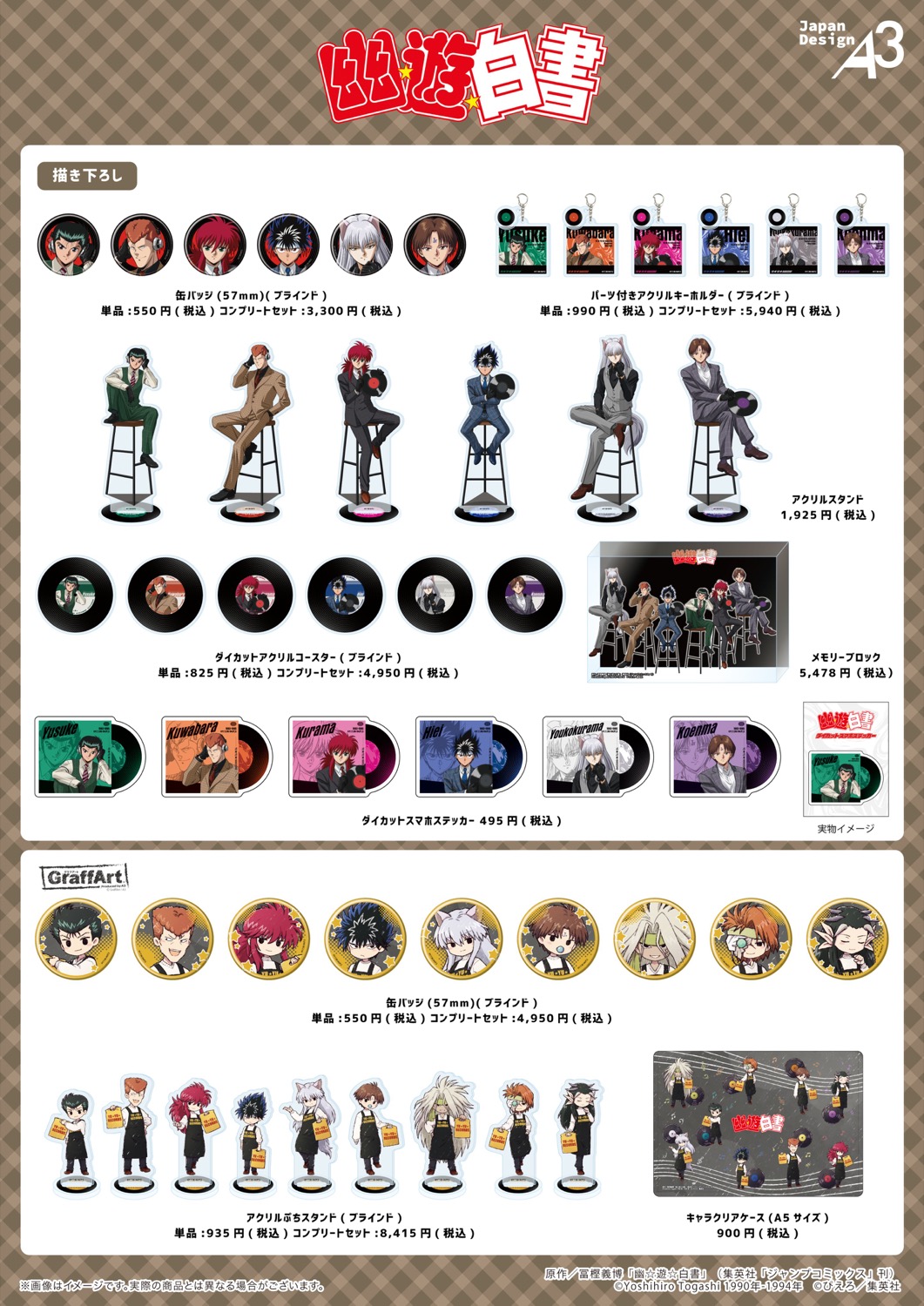 スーツ姿の浦飯幽助、桑原和真、蔵馬、飛影、妖狐、コエンマの描き下ろしイラストや、タワレコ店員に扮したキャラクターの新作グラフアートを使用した新商品が多数ラインナップ!