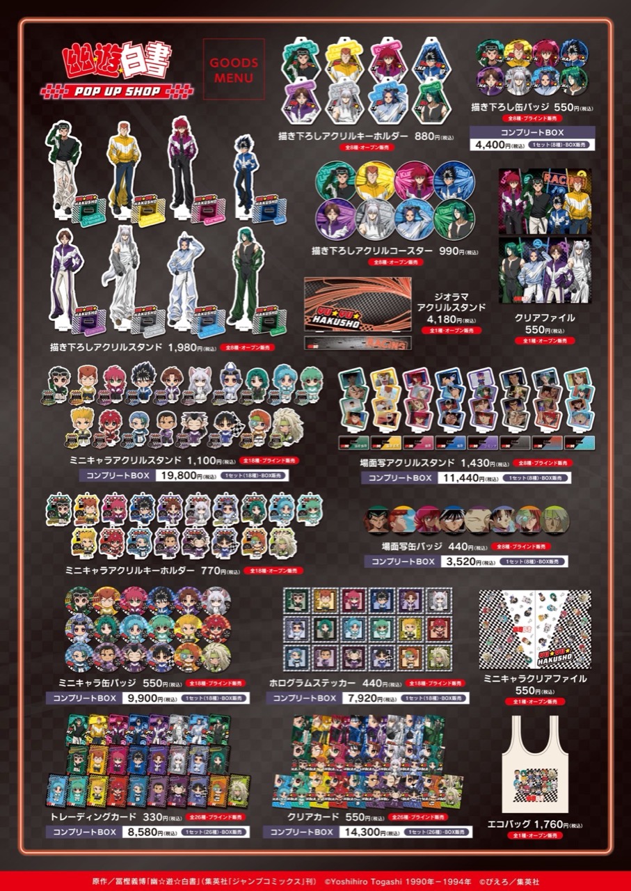 「幽☆遊☆白書 (幽遊白書)」ポップアップストアでは、浦飯幽助・桑原和真・飛影・蔵馬・妖狐蔵馬・コエンマ・死々若丸・樹たちが”レーシングコーデ”に身を包む描き下ろしイラストを使用したグッズが多数販売!