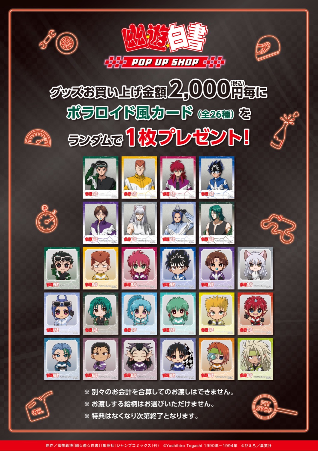 「幽☆遊☆白書 (幽遊白書)」ポップアップストアにて、グッズをお買い上げ2,000円(税込)毎に特典として「ポラロイド風カード 全26種」がランダムに1枚プレゼントされる。