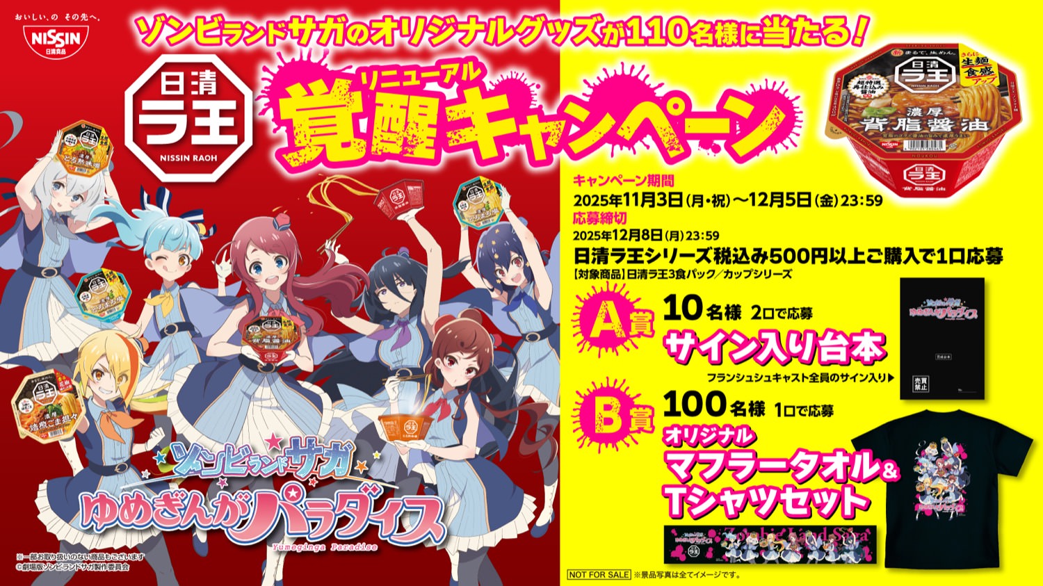 佐賀を舞台にした新感覚ゾンビアイドル系アニメの劇場版『ゾンビランドサガ ゆめぎんがパラダイス』× 日清ラ王による、覚醒(リニューアル)コラボ開催!