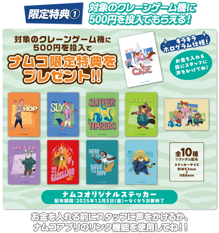 「ズートピア2 × ナムコ」キャンペーンでは、スタッフにお声掛けのうえ、対象のクレーンゲームに500円投入するとオリジナルノベルティー「ステッカー (全10種)」をプレゼント!