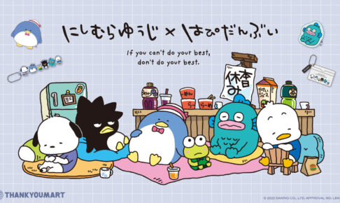 サンリオの人気キャラクターユニット「はぴだんぶい」× SNS上で人気を集める「にしむらゆうじ」さんによるコラボ限定グッズが、2023年10月下旬より全国のサンキューマートにて発売。人間味のある世界観で”頑張らない”をしている「はぴだんぶい」が特徴的な、「にしむらゆうじ」さん描き下ろしデザインのグッズが登場!