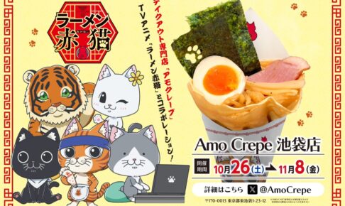 少年ジャンプ+(集英社)にて連載中のアンギャマン先生による人気漫画を原作としたアニメ「ラーメン赤猫」× Amo Crape池袋にて、2024年10月26日〜11月8日までコラボが開催される。ラーメンをイメージした特製クレープをはじめ、コラボクレープやドリンクが登場。描き下ろしオリジナルグッズも販売!