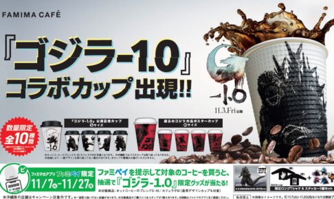 日本が世界に誇る怪獣王「ゴジラ」の最新映画『ゴジラ-1.0 (マイナスワン)』× ファミリーマート全国にて、2023年11月7日〜11月27日までコラボキャンペーンが開催される。「FAMIMA CAFÉ」ブレンド・カフェラテに『ゴジラ-1.0』コラボカップ全10種が数量限定で登場する他、スタンプキャンペーンも!