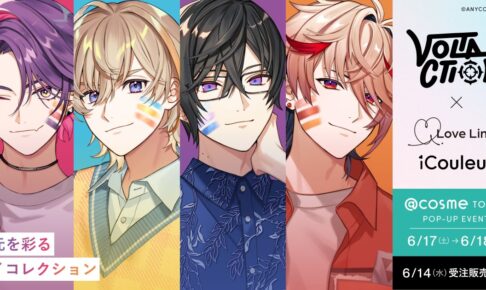 大人気バーチャルライバーグループ「にじさんじ」に所属する風楽奏斗 / 渡会雲雀 / 四季凪アキラ / セラフ・ダズルガーデンらのユニット「VOLTACTION (ヴォルタクション)」× ラブ・ライナーによるコラボコスメが、2023年6月14日より登場!描き下ろしイラストを使用した「アクリルスタンド」も登場する。