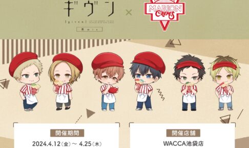 キヅナツキ先生による人気漫画を原作としたアニメ「ギヴン」の、続編アニメ映画「ギヴン 柊mix」× マリオンクレープによるコラボが、2024年4月12日〜4月25日までの期間限定で開催される。春樹と秋彦・真冬と立夏・柊と玄純らをイメージしたコラボメニューや、描き起こしイラストを使用したグッズが登場!