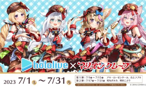 大人気Vtuberグループ「ホロライブ」× マリオンクレープ全国にて、2023年7月1日〜7月31日までの期間限定でコラボ開催!「ホロライブ × マリオンクレープ」では、アキ・ローゼンタール / 白上フブキ / 尾丸ポルカ / 博衣こよりさんらが考案したコラボメニューや、描き下ろしイラストグッズが登場!