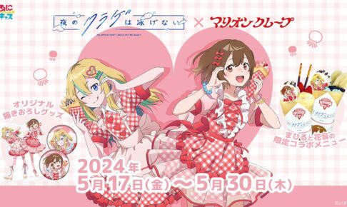 アニメ「夜のクラゲは泳げない (ヨルクラ)」× マリオンクレープ3店舗(渋谷・秋葉原・池袋)にて、2024年5月17日〜5月30日までコラボが開催される。光月まひる役の伊藤美来さんと、山ノ内花音役の高橋李依さん考案によるコラボクレープ、描き下ろしイラストを使用したコラボ限定グッズがラインナップ!