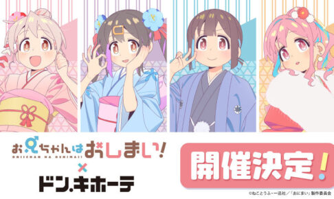 ねことうふ先生による人気漫画を原作としたアニメ「お兄ちゃんはおしまい!」× 全国のドン・キホーテにて、2024年1月27日よりコラボグッズが発売される。”お正月”をテーマに、晴れ着姿のまひろ・みはり・かえで・もみじら4名の描き下ろしイラストを使用したアクリルスタンド・缶バッジなどドンキ限定グッズがラインナップ!