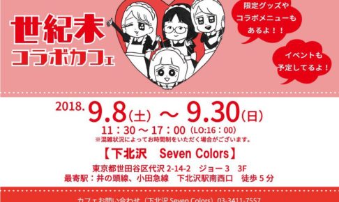 マンガ家「世紀末」× ヴィレッジヴァンガードにて2018年9月8日〜9月30日までの期間限定で下北沢 Seven Colorsにて「世紀末コラボカフェ」開催決定!!世紀末さんのイラストをイメージしたコラボメニューが登場予定!ヴィレッジヴァンガード自由が丘による限定グッズも!