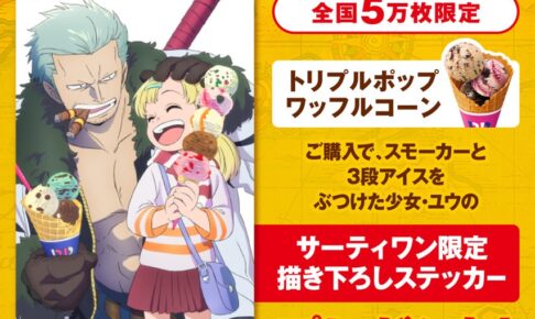 尾田栄一郎先生による大人気漫画を原作とするTVアニメ「ONE PIECE (ワンピース)」× サーティワンのコラボにて、2025年4月11日より3段アイス (トリプルポップ ワッフルコーン) を購入すると、モーカーとユウちゃんの「描きおろしステッカー」を全国5万枚限定で配布!