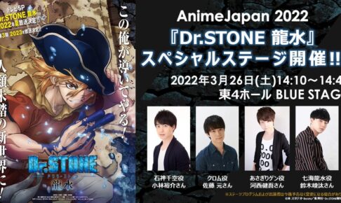 「稲垣理一郎 / Boichi」両先生による人気漫画を原作としたテレビアニメのスペシャル「Dr.STONE 龍水」が2022年夏に放送される。これに先駆け、本作のメインキャストである石神千空役・小林裕介さんら4人が登壇するスペシャルステージが、2022年3月26日の「AnimeJapan 2022」にて開催!