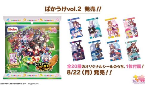 Cygames (サイゲームス) が贈る大人気の育成アプリゲーム「ウマ娘 プリティーダービー」× 栗山米菓の定番お煎餅「ばかうけ」のコラボ第2弾「ぱかうけ2 タマモクロス特製 出汁香るたこ焼き風味」が2022年8月22日より発売。オリジナルシール全20種の中から1枚がランダムで付属する。