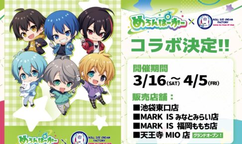 楽しいを届ける歌い手グループ「めろんぱーかー (めろぱか)」× ロールアイスクリームファクトリーによるコラボが、2024年3月16日〜4月5日までの期間限定で開催される。「めろぱか × ロールアイス」コラボでは、メンバーをイメージしたコラボメニューや、描き起こしイラストを使用したコラボ限定のグッズが登場!