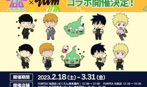 ONE先生による人気漫画を原作としたアニメ「モブサイコ100 Ⅲ」× YUMTEA3店舗(池袋・大阪・水戸)にて、2023年2月18日〜3月31日までコラボが開催される。コラボドリンクを注文の方に影山茂夫・律・霊幻新隆・花沢輝気・エクボらのコースター、描き起こしミニキャライラストを使用したコラボグッズも発売!