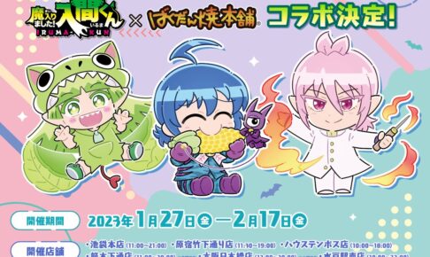 週刊少年チャンピオン (秋田書店) にて連載中「西修」先生による大人気漫画を原作としたTVアニメ「魔入りました! 入間くん」× ばくだん焼本舗6店舗にて、2023年1月27日〜2月17日までコラボ開催! メニューなどの詳細発表に先駆け、入間くんやアスモデウスらの描き起こしミニキャライラストが解禁された。