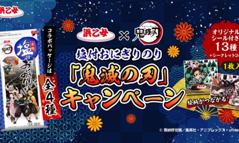 吾峠呼世晴先生による人気漫画を原作としたアニメ第2期 遊郭編も2021年に放送が決定したTVアニメ「鬼滅の刃」× 名古屋の乾物メーカー「浜乙女」による「鬼滅の刃 塩付おにぎりのり」が2021年3月下旬より発売開始!絵柄が繋がるオリジナルシール付きでコラボパッケージののりが当たるTwitterキャンペーンも!
