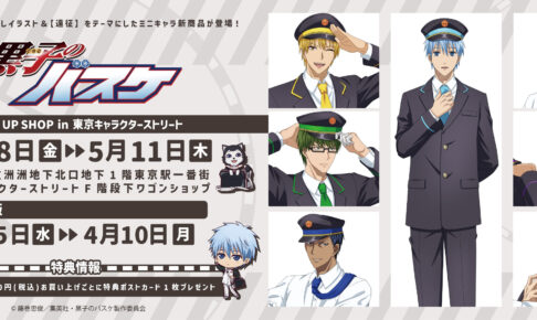 藤巻忠俊先生による人気漫画を原作としたアニメ「黒子のバスケ (黒バス)」× 株式会社A3のポップアップストアが、東京キャラクターストリートにて2023年4月28日〜5月11日まで開催される。アニメ「黒子のバスケ」ポップアップストアでは、駅員の衣装に身を包む描き下ろしイラストを使用した新作グッズが多数登場!