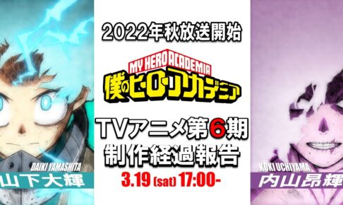 堀越耕平先生による大人気漫画を原作としたテレビアニメ「僕のヒーローアカデミア (ヒロアカ)」の緑谷出久役・山下大輝さんと死柄木弔役・内山昂輝さんへのSPインタビュー番組「TVアニメ第6期 制作経過報告」が、2022年3月19日 17時よりYouTubeのTOHO animationチャンネルにてプレミア配信!