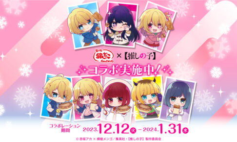 「赤坂アカ / 横槍メンゴ」先生らによる人気漫画を原作としたアニメ「【推しの子】」× 全国のたこ焼きチェーン店「築地銀だこ」にて、2023年12月12日〜2024年1月31日までコラボが開催される。アイ・ルビー・かな・MEMちょらをイメージした「ステッカー」や「ポストカード」が付属するコラボたこ焼きが登場!