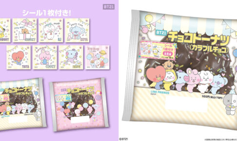 それぞれが違う魅力で宇宙最高のスターを目指す「BT21」のオリジナルパッケージに包まれた「BT21チョコドーナツ(カラフルチョコ)」が、2022年4月19日より全国のファミリーマートにて発売される。KOYA・TATA・CHIMMY・RJ・SHOOKY・COOKY・MANG達のオリジナルシールが付属する。