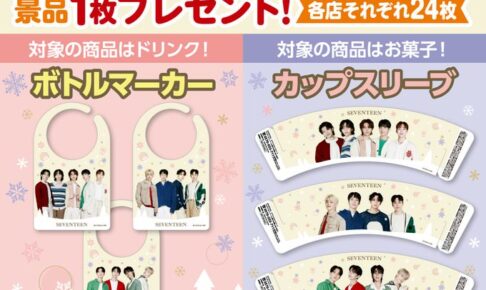 大人気アイドルグループ「SEVENTEEN (セブンティーン / セブチ)」× 全国のセブンイレブンにて、2023年12月12日より「ボトルマーカー」が貰えるキャンペーンが実施される。対象商品を一度に2本購入の方に、SEVENTEENの「ボーカル」「HIPHOP」「パフォーマンス」の全3種より1枚プレゼント!