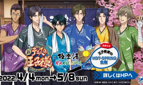 ジャンプSQ. (スクエア) にて連載中「許斐剛」先生による人気漫画を原作としたTVアニメ「新テニスの王子様」× 極楽湯 & RAKU SPA 15店舗にて2022年4月4日より「おまたせ 王子様達のHOT・SPRING合宿」を開催。コラボメニューの提供やグッズ販売の他に、期間限定のコラボ風呂なども実施!
