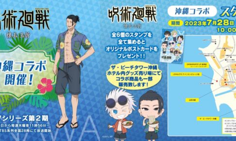 芥見下々先生原作のアニメ「呪術廻戦」第2期「懐玉・玉折」× 共立リゾート「ザ・ビーチタワー沖縄」にて、2023年7月28日〜8月27日まで沖縄コラボキャンペーンが開催される。水着姿の五条悟と夏油傑の描き下ろしイラストを使用した等身絵柄のグッズや、ソーキそばを食べる五条悟と夏油傑のデフォルメグッズなど多数登場!