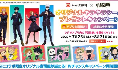 芥見下々先生による人気漫画を原作としたアニメ「呪術廻戦」× 全国のかっぱ寿司にて、2022年7月23日〜8月21日までキラキラシールが貰えるコラボキャンペーンが開催される。かっぱ寿司にて税込2,000円利用かつ、アプリを提示の方に虎杖悠仁・伏黒恵・五条悟らの「キラキラシール 全5種」をランダムに1枚プレゼント!