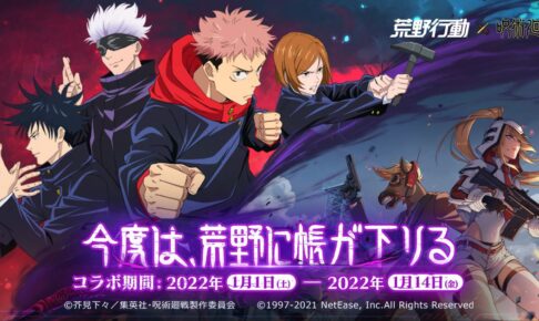 芥見下々先生による人気漫画を原作としたテレビアニメ「呪術廻戦」× 荒野行動によるコラボイベント「今度は、荒野に帳が下りる」が開催。コラボを記念してコラボビジュアルと共に呪術廻戦の世界から虎杖悠仁・伏黒恵・釘崎野薔薇・狗巻棘・禪院真希・パンダたちが荒野行動の世界に降り立つ姿が描かれた。