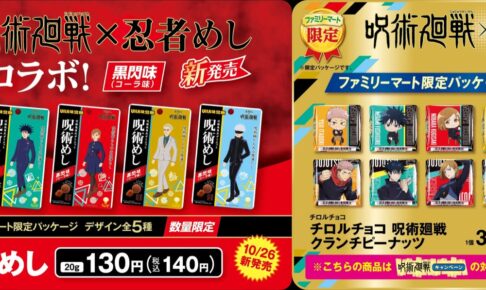 芥見下々先生による人気漫画を原作としたTVアニメ「呪術廻戦 (じゅじゅつかいせん)」× ファミリーマート全国にて、2021年10月26日よりファミマ限定の呪術廻戦コラボお菓子発売!UHA味覚糖の人気商品“忍者めし”とコラボした「呪術めし」や、呪術廻戦パッケージを使用した限定チロルチョコが登場する。