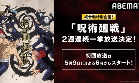芥見下々先生による人気漫画を原作としたTVアニメ「呪術廻戦」がABEMAアニメ2チャンネルにて5月9日と16日に無料一挙放送! 5月9日 (5月8日深夜〜) は第1話〜13話、5月16日 (5月15日夜〜) は第14話〜24話をオンエア! 放送後には「ABEMAビデオ」でも1週間無料視聴可能!!