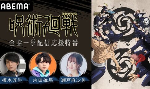 芥見下々先生による人気漫画を原作としたTVアニメ「呪術廻戦」の全話一挙配信と一挙配信応援特番がABEMAアニメチャンネルにて独占生配信!2021年4月3日20時30分より配信の特番では虎杖悠仁 役「榎木淳弥」、伏黒恵 役「内田雄馬」、釘崎野薔薇 役「瀬戸麻沙美」さんらが出演されアニメの振り返りトークをお届け!